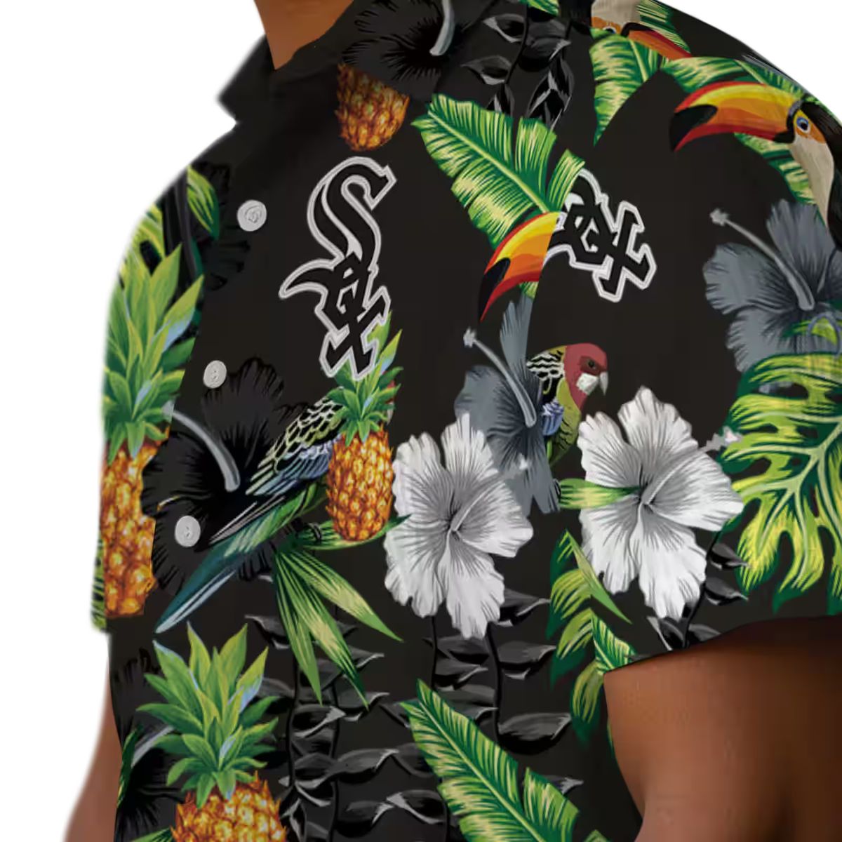 The Women’s Chicago White Sox Tropical Hawaiian Shirt with Hibiscus, Pineapple & Toucan Print is a vibrant blend of tropical flair and baseball spirit. Featuring bold black and green hues, this shirt showcases an eye-catching pattern of toucans, hibiscus flowers, and juicy pineapples that bring the Aloha vibe to life. Perfect for fans who want to celebrate their love for the Chicago White Sox in style, this shirt offers a unique fusion of summer freshness and team pride.