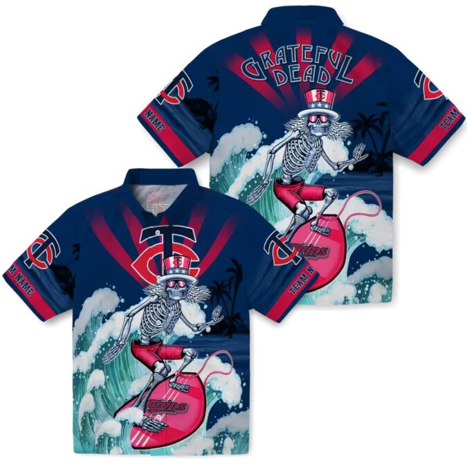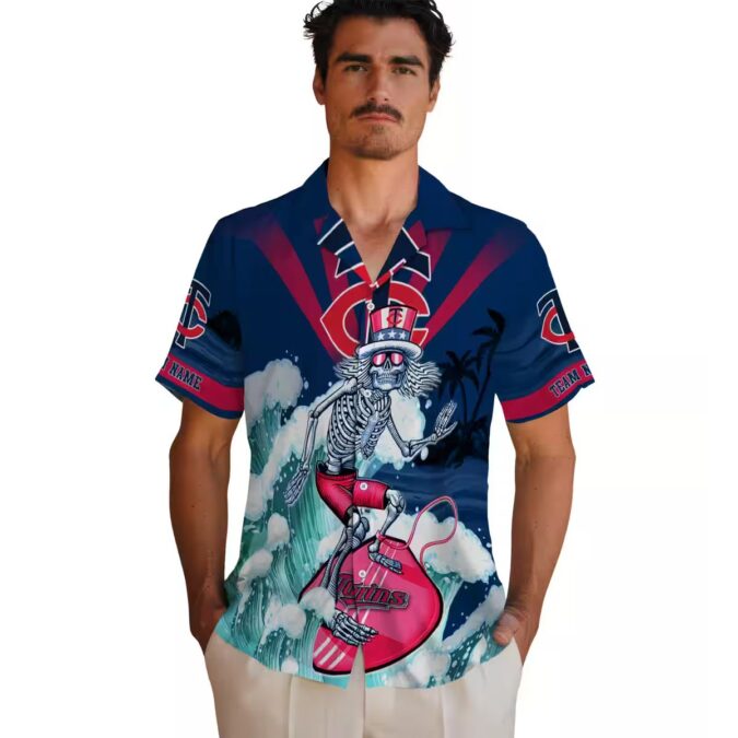 The Minnesota Twins Navy Blue Tropical Shirt – Custom Surfing Skeleton Design is the perfect blend of tropical style and MLB fan pride. Featuring a bold surfing skeleton design set against a vibrant navy blue backdrop, this shirt captures the essence of summer and baseball.