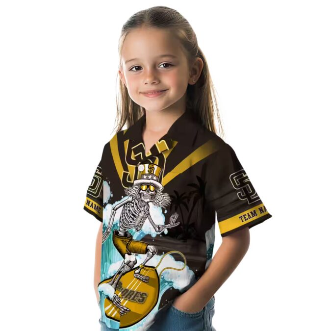 The Custom MLB Team Padres Brown Blue Hawaiian Shirt – Surfing Skeleton Design for Fans brings a bold twist to your summer wardrobe with its unique blend of fan pride and beach-ready style. Featuring a vivid brown and blue color palette, this shirt showcases an eye-catching surfing skeleton design set against tropical backgrounds perfect for Padres fans who love to stand out.